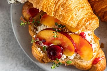 From classic almond croissants to savory fig, brie & prosciutto, our menu satisfies every craving—including decadent desserts like Chocolate Mousse Bombs or nostalgic Banana Pudding, perfectly paired with coffee, hot chocolate, or fizzy fruit-flavored mocktails.